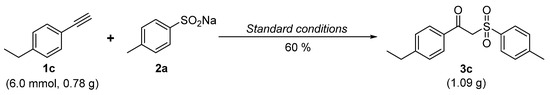 APA StyleYu, S.-W., Chen, Z.-J., Li, H.-Q., Li, W.-X., Li, Y., Li, Z., & Wang, Z.-Y. (2024). Oxysulfonylation of Alkynes with Sodium Sulfinates to Access β-Keto Sulfones Catalyzed by BF3·OEt2. Molecules, 29(15), 3559. https://doi.org/10.3390/molecules29153559