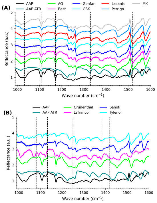 IR spectra of acetaminophen (AAP) using QCL spectroscopy; the vertical dashed lines represent the locations of the main bands. (A) Spectra of AAP in different brands containing AAP as the only API. (B) Spectra of AAP in different brands containing AAP and other APIs.