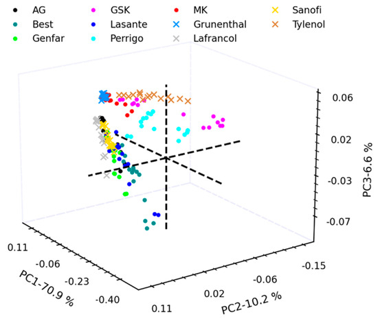 Figure 2 shows the score plot. The score plot is a crucial visual representation used in PCA. The score plot displays the data points from the original high-dimensional dataset projected onto the new, lower-dimensional space created by the PCs. Each data point is represented by a dot in the plot, and its co-ordinates correspond to its scores on the chosen PCs. Typically, the first two or three PCs are used for visualization, as they capture the most significant variance in the data [46]. Figure 2 shows that PCA explains 87.7% of the variance. In this diagram, samples containing AAP as the only API are represented by dots, while those with multiple APIs are denoted by crosses. The diagram prominently showcases the grouping of samples from MK, Grunenthal, Perrigo, Lafrancol, and Tylenol laboratories, while the remaining samples are not distinctly separated, rendering them indistinguishable from one another. Additionally, the tested samples can be classified in two ways: firstly, based on their concentration (250 mg, 325 mg, 500 mg, and 650 mg) and, secondly, based on the presence or absence of additional components different from acetaminophen (such as ibuprofen, codeine, tramadol, guaifenesin, and phenylephrine), as shown in Table 1. Upon analyzing the Score diagram, it becomes apparent that the PCA method primarily attempts to classify the samples based on concentration, resulting in the formation of two distinct groups. One group comprises samples with a concentration of 500 mg, located in the grouping’s borders (AG, Best, Genfar, GSK, Lasante, MK, and Sanofis), which happens to be the most prevalent concentration among the samples, while the other group consists of samples with concentrations different than 500 mg located in the center of the grouping (Perrigo, Grunenthal, Lafrancol, and Tylenol). However, this form of classification fails to adequately distinguish the components of the GSK and MK laboratories, as their samples are placed near the group with concentrations different from 500 mg. Moreover, samples with multiple APIs tend to be clustered by the PCA model with three PCs, as observed with the well-grouped brands Sanofi, Lafrancol, Grunenthal, and Tylenol.