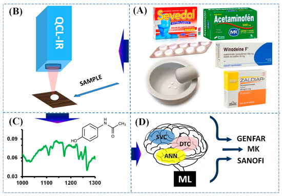 This research will propose new methodological strategies that, when applied, would contribute to solving problems associated with the identification and classification of chemicals present in different matrices. Having an analytical method based on infrared spectroscopy for the detection of active pharmaceutical ingredients (in our case AAP) combined with ML is of interest to the pharmaceutical industry and law enforcement agencies. It allows easy and fast molecular information to be obtained to determine whether an API is present in a certain pharmaceutical product and whether it belongs to a brand declared on the label. Using the proposed method will make it possible to know whether the drug is present as a desired product or whether it is a counterfeit drug.