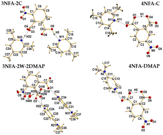 Crystal structures of the 3NFA-2C, 4NFA-C, 4NFA-DMAP, and 3NFA-2W-2DMAP cocrystals. Hydrogen bonds are denoted with dashed lines. Displacement ellipsoids are plotted at 50% probability level.