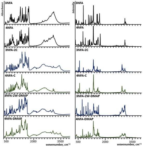The measured IR and Raman spectra of the studied cocrystals are shown in Figure 3. Notably, IR and Raman spectra of the studied cocrystals do not contain the bands of the 3NFA and 4NFA compounds, which testifies to the purity of the obtained cocrystals (1:1 or 1:2 composition). The X-ray results clearly point out the formation of the cocrystals (Figure 2).