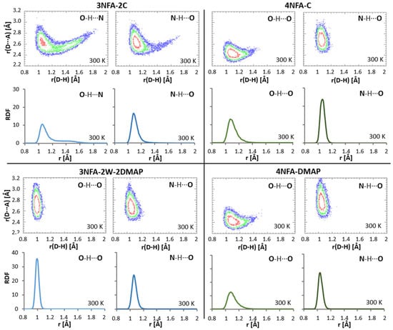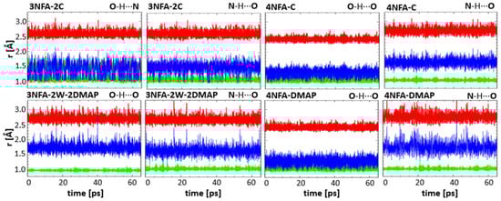 The time evolution of donor–proton (green, d(DH) in Å), proton–acceptor (blue, d(AH) in Å), and donor–acceptor (red, d(DA) in Å) distances simulated by the CP-MD method in the solid state (T = 300 K) for the 3NFA-2C, 4NFA-C, 3NFA-2W-2DMAP, and 4NFA-DMAP complexes.