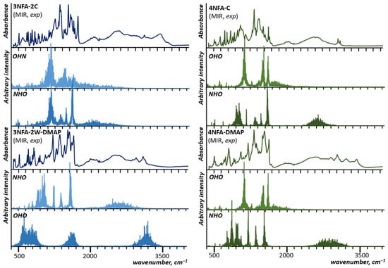 The CP-MD simulations showed a considerable difference in the positions of the bands assigned to the proton vibrations in the inter- and intramolecular hydrogen bonds. The broad band (2000–800 cm−1), assigned to the ν(OH) vibration of the OHO intramolecular hydrogen bond, is visibly red-shifted with respect to the ν(OH/NH) band (2900–2300 cm−1), assigned to the OHN intermolecular hydrogen bonds (cf. the OHO spectra with the OHN spectra of 4NFA complexes in Figure 5). This shift, according to the Badger and Bauer rule [], confirms the intramolecular hydrogen bond to be much stronger compared to the intermolecular one. This result is in agreement with the accomplished X-ray measurements (Table 1).