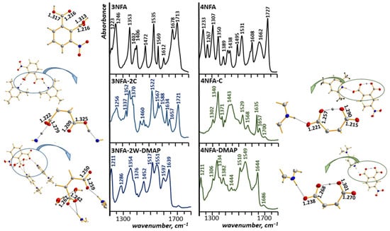 Preliminarily, the bands of the 3NFA compound were analyzed within the range of 1800–1500 cm−1 (Figure 6). The spectrum of this compound features bands at 1713 cm−1 and 1678 cm−1 (spectrum 3NFA in Figure 6), assigned to the ν(C=O) vibrations of carboxyl groups located in the plane and perpendicular to the phenyl ring, respectively (see crystal structure of 3NFA ref. []). The spectrum of the 3NFA-2C cocrystal is characterized by two bands in the same range. The band at 1721 cm−1 (Figure 6) is assigned to the ν(C=O) vibration of the C(8)O(6)O(5)H(5) carboxyl group, and it is typical for the OH⋯N hydrogen bond without proton transfer (cf. spectra of the 3NFA compound and spectra of the 3NFA-2C and 3NFA-2W-DMAP cocrystals, Figure 6).