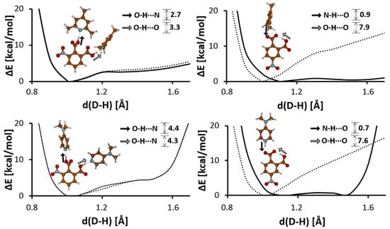 To state if the studied hydrogen bonds are classified as LBHBs, the potential energy curves on proton transfer in the hydrogen bonds were calculated by the DFT method in vacuo. The calculations of the potential curves were made up for the optimized structures of the studied complexes under a gradual elongation of the distance of the O-H/N-H bond at optimization of the rest of structural parameters. When it comes to the 3NFA complexes, the most stable form is the one with both bridging protons belonging to the carboxyl groups. The calculated potential curves for the 3NFA-2C and 3NFA-2DMAP complexes are rather gently sloped under a small barrier (2.7 and 4.4 kcal/mol, Figure 7). The potential curves on proton transfer are pretty similar in both bonds of the complex (see solid and dotted lines, Figure 7). According to papers [,,,,,,], this picture indicates the possibility of proton transfer in the polar environment (e.g., in the solid state). This fact is approved by the X-ray measurements showing the protonation of 2,4,6-collidine in the 3NFA-2C cocrystal. A similar trend for the potential curve is typical for the intermolecular hydrogen bond in complexes of nitrobenzoic acid with pyridine or dimethylpyridine [,,]. The potential curves on proton transfer in the OHN intermolecular hydrogen bond in the 4NFA-2C and 3NFA-2DMAP complexes is almost symmetrical with two energy minima with a very low barrier (ΔE = 0.7 and 0.9 kcal/mol), which means that this hydrogen bond falls into the LBHB category. As to the intramolecular hydrogen bond in the 4NFA complexes, the potential energy curve takes a form different from that for the 3NFA complexes. The most stable structure of the 4NFA complexes is the form with one proton transferred from the carboxyl group to the nitrogen atom of pyridine derivatives (Figure 7). The potential energy curve on proton transfer in the OHO intramolecular hydrogen bond does not reveal a distinctive second local minimum, though the hydrogen bond is very short. This phenomenon is observed under the matrix isolation condition [,] or in solvents at low temperatures [] with very strong hydrogen bonds, where proton transfer occurs in a number of intermediate states described by potentials with an almost symmetrical single minimum (so-called “mesomeric” scheme []).
