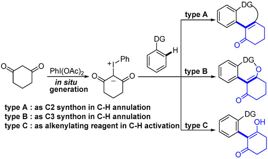 Transition-metal-catalyzed directed C–H activation has emerged as an atom/step-economical method for the rapid synthesis of various useful molecules [10,11,12,13]. In contrast to the traditional cross-coupling of iodonium ylides with nucleophiles, directly using iodonium ylides as a significant coupling partner in transition-metal-catalyzed C–H activation reactions are especially appealing. In 2020, the Li group first applied iodonium ylides as carbene precursors in Rh(III)-catalyzed directed C–H activation reactions under mild and redox-neutral conditions [14]. Since then, a large number of studies have reported employing iodonium ylides as a novel and emerging carbene precursor in transition-metal-catalyzed chelation-assisted C–H functionalization [15,16,17,18,19,20,21,22,23,24,25,26,27,28,29,30,31,32,33,34,35,36,37,38,39,40,41,42,43,44,45,46,47,48,49,50,51,52,53,54]. To the best of our knowledge, only one simple review of 21 examples using iodonium ylides in transition-metal-catalyzed C–H functionalization was reported by the Kanchupalli group in 2022 [55]. However, after the publication of Kanchupalli’s review, there are many studies (about 20 references) on the C–H functionalization of iodonium ylides, which was intensively reported in 2023 and 2024. Herein, we aim to provide a comprehensive overview of transition-metal-catalyzed C–H functionalization utilizing iodonium ylides with multifunctional coupling characteristics over the last 5 years. It should be noted that most of the carbene precursors were limited to the cyclic 1,3-diketones-derived iodonium ylides, because this type of transformation may be sensitive to the steric hindrance of iodonium ylides. Based on the different forms of iodonium ylides in C–H transformations, this review article is organized into three sections: (1) those serving as C2 synthon in C–H annulation, (2) serving as C3 synthon in C–H annulation, or (3) serving as an alkenylating reagent in C–H functionalization (Scheme 1).