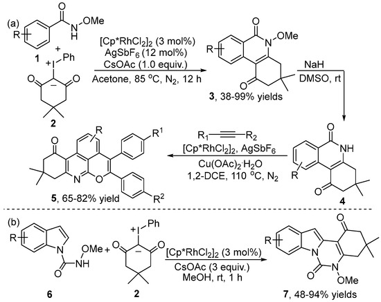 In 2020, Mayakrishnan and co-workers [15] reported Rh(III)-catalyzed arene C–H annulation of N-methoxybenzamides 1 with iodonium ylide 2 as a carbene precursor for the assembly of dihydrophenanthridines 3 (Scheme 2a). A wide range of substrates were compatible with this catalytic system. Importantly, the potential synthetic utility of the coupling product 3 was demonstrated by synthesizing pyranoisocoumarin 5. The optoelectronic properties of product 5 were tested by UV/vis and fluorescence spectrometers. The results showed excellent optical properties with emission maxima, with the potential to be used in the photoelectric and biomedical imaging fields. Very shortly after Mayakrishnan’s publication, Ji and co-workers [16] also developed a similar procedure (Scheme 2b). They disclosed a Rh(III)-catalyzed cross-coupling reaction of N-carboxamide indole 6 with iodonium ylide 2 to deliver indoloquinazolinone 7. Various substrates with different substituents were well tolerated in this transformation.