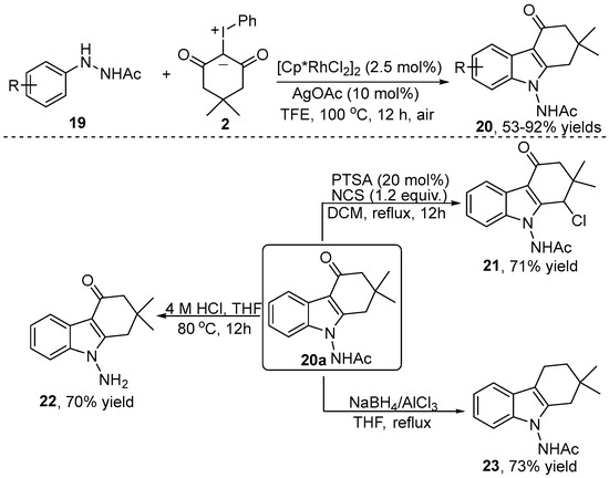 Tetrahydrocarbazol-4-ones are a privileged scaffold found in numerous bioactive molecules and drugs, such as ondansetron and heat shock protein inhibitor. In this regard, Liu et al. [22] independently reported an approach to produce tetrahydrocarbazol-4-one 20 via the [4+2] annulation of readily available arylhydrazine 19 with iodonium ylide 2 by using [Cp*RhCl2]2 as a catalyst and AgOAc as an additive (Scheme 8). A variety of substrates with different substituents were well tolerated in this transformation. It should be noted that the authors demonstrated the utility of this strategy by performing a gram-scale experiment of product 20. The tetrahydrocarbazol-4-one 20a was further derived to produce the corresponding compounds 21, 22 and 23 via substitution, hydrolysis and reductive hydrogenation reactions, respectively.