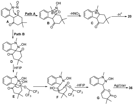 This transformation underwent C–H bond activation, carbene migratory insertion and protonation processes to deliver alkylation intermediate A. In pathway A, the intramolecular cyclization and denitrosation of intermediate A provided the desired product 20. However, in pathway B, the intermediate D formed via intramolecular C-nucleophilic addition underwent ring opening of cyclohexanedione to generate the intermediate E. Intermediate E underwent tautomerization and intramolecular transesterification/cyclization to furnish intermediate G, which finally delivered product 36 via Ag(I)/O2-mediated aromatization-driven oxidative dehydrogenation (Scheme 13).