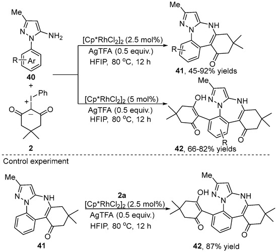 In 2023, Huang’s group [29] accomplished a Rh(III)-catalyzed selective mono- and dual-C–H bond unsymmetrical functionalization/cyclization of 1-aryl-5-aminopyrazole 40 and iodonium ylide 2 using the aromatic NH2 moiety as the directing group, leading to fused benzodiazepine skeletons 41 and 42 (Scheme 15). The amount of iodonium ylides played an important role in chemo-selectivity. In particular, dual-C–H functionalization proceeded via the utilization of three equivalence of iodonium ylides to give product 42. To elucidate the reaction mechanism, the reaction between product 41 and iodonium ylides was performed under optimal reaction conditions to obtain an 87% yield of product 42. This result indicated that product 41 was a possible intermediate in the dual C–H functionalization process.