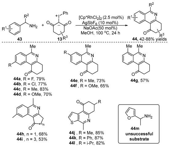 Compared with the aromatic NH2 group, the aliphatic NH2 group-directed C–H functionalization has attracted great attention because the aliphatic NH2 unit has poor coordination abilities and is easily oxidized by oxidants. In this aspect, our group [30] revealed a Rh(III)-catalyzed free aliphatic amines-assisted arene C–H bond coupling/annulation of primary benzylamine 43 with iodonium ylide 13 using air as a green oxidant (Scheme 16). This reaction provided a general, green and step-economic approach to construct a wide range of dihydrophenanthridin-1-one 44, which are bioactive scaffolds found in numerous natural products. Excellent functional group tolerance and regioselectivity of this catalytic system were observed, except for the furanylmethanamine (44m).