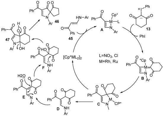 A plausible mechanism was proposed (Scheme 18). After the coordination of enaminone 45 to a cationic metal catalyst, direct alkenyl C–H bond activation occurred and gave four-membered cyclometalated species A. Subsequently, coordination of iodonium ylide 13 and the elimination of PhI led to the formation of metal intermediate B, which was followed by the migratory insertion and protonation processes to generate intermediate D. Then, the intermediate E obtained through the oxidative dehydrogenation of intermediate D underwent intermolecular nucleophilic addition and intramolecular nucleophilic cyclization to generate product 47. Product 47 could be further converted to 46 by the dehydration, annulation and pinacol rearrangement.