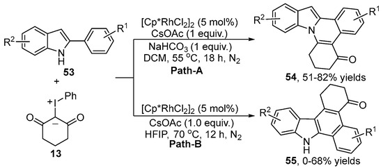 In view of the biological and pharmacological activities of the indolo [2,1-a]isoquinoline derivatives and benzo[a]carbazoles, Kanchupalli [34] developed a condition-controlled Rh(III)-catalyzed regioselective C–H activation of 2-arylindole 53 with iodonium ylide 13, leading to the generation of indolo [2,1-a]isoquinolines derivative 54 and benzo[a]carbazole 55 (Scheme 20). This protocol was conducted in DCM using NaHCO3 as a base to merely produce the indolo [2,1-a]isoquinolines derivative 54. In contrast, switching DCM to HFIP without any base led to benzo[a]carbazole 55 with an excellent chemoselectivity. The H/D exchange experiment and KIE experiment revealed that the C–H activation process was reversible and was not involved in the rate-determining step.
