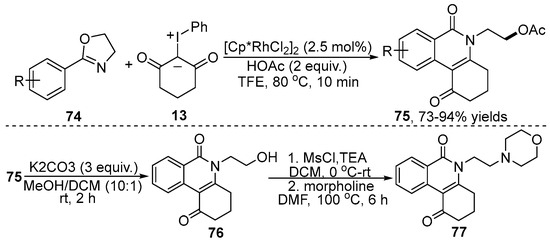 Switchable group-directed C–H functionalization is of great significance for the synthesis of valuable skeleton structures due to the facile transformations from the switchable group. More recently, Liu and co-workers [40] realized oxazoline-directed Rh(III)-catalyzed C–H functionalization of oxazoline 74 with iodonium ylide 13 to give isoquinolone derivative 75 in a relatively high yield (Scheme 25). This reaction was compatible with a range of oxazolines and iodonium ylides. Moreover, the product could be further functionalized for the construction of the corresponding morpholine derivative 77, which is useful for diverse chemical transformations in organic synthesis.