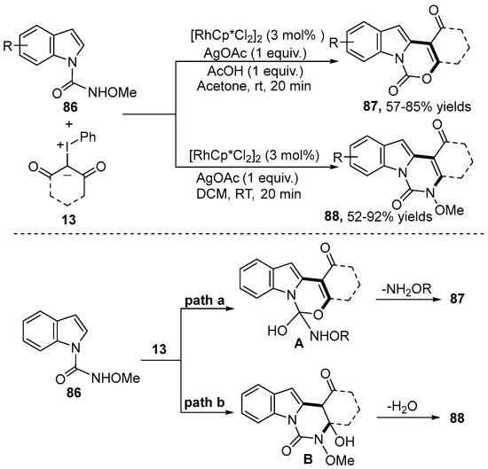 - Nunewar, S.; Kumar, S.; Pandhare, H.; Nanduri, S.; Kanchupalli, V. Rh(III)-Catalyzed Chemodivergent Annulations between Indoles and Iodonium Carbenes: A Rapid Access to Tricyclic and Tetracyclic N-Heterocylces. Org. Lett. 2021, 23, 4233–4238. [Google Scholar] [CrossRef] [PubMed]