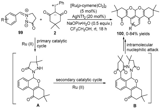 Given that the Ru(II) catalyst has been shown to efficiently catalyze C–H bond activation reactions with outstanding efficiency, the Wu group [50] described the selective [3+3] cycloaddition of azomethine imine 99 with iodonium ylide 2 using relatively cheap [Ru(p-cymene)Cl2]2 as the catalyst and the azomethine imine group as a switchable and transient directing group (Scheme 37). This reaction underwent dual C–H bond activation and dual intramolecular nucleophilic attack, leading to a variety of the pyrano[de]isochromene 100. Furthermore, the H/D exchange experiment indicated that the C–H cleavage was reversible and was faster in the overall reaction. The reaction mechanism was similar to that described above, except for the rearrangement pathway of the directing group in the secondary catalytic cycle.