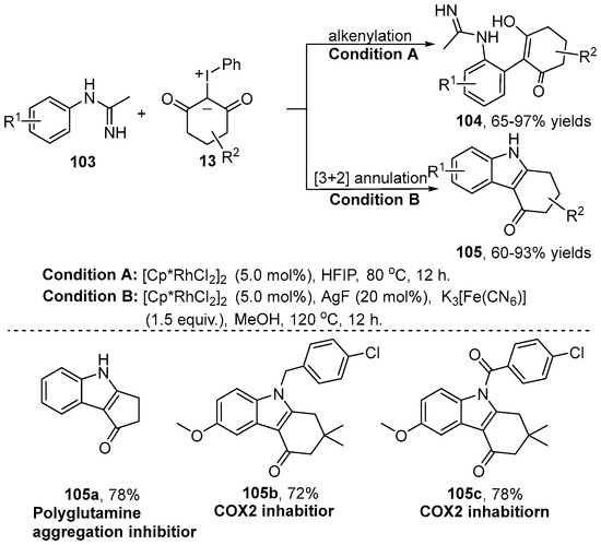 More recently, a condition-controlled reaction of N-aryl amidine 103 and iodonium ylide 13 via a Rh(III)-catalyzed C–H bond functionalization had been developed by the Wu group [52] (Scheme 39). This reaction was conducted in HFIP at 80 ℃ to give the alkenylating product 104. However, switching the solvent to MeOH in the presence of AgF/K3[Fe(CN)6] as the additive resulted in the formation of the [3+2] product carbazolone 105 through an intermolecular annulation process. It is worth mentioning that this protocol provided rapid and efficient access to synthesize the polyglutamine aggregation inhibitor 105a and the COX-2 inhibitor 105b–105c.
