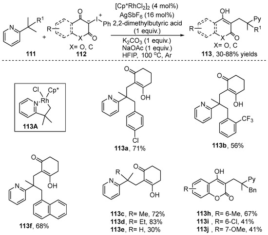 Another C–H alkenylation reaction employing iodonium ylides based on carbene migratory insertion has been demonstrated by Liu and co-workers [54] (Scheme 41). They developed an inactivated methyl C–H alkenylation using iodonium ylide 112 as a carbene precursor to generate the coupling product 113. A wide range of substrates bearing various functional groups such as halogen, methoxy, trifluoromethyl and naphthyl rings were compatible with this reaction. To explore the reaction mechanism, the stable cyclometalated Rh(III) complex 113A was isolated, which could efficiently catalyze the reaction to generate the desired product.