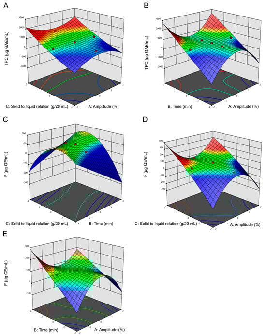 Response surface plots of ultrasound-assisted extraction (UAE) of total phenolic compounds (TPC) and flavonoids (F). Influence on TPC extraction of (A) solid/liquid ratio vs. UAE amplitude; (B) UAE time vs. amplitude. Influence on F content of (C) solid/liquid ratio vs. UAE time; (D) Solid/liquid ratio vs. UAE amplitude; and (E) Time vs. UAE amplitude. Blue and red areas represented low and high yields of TPC and F concentration, respectively.