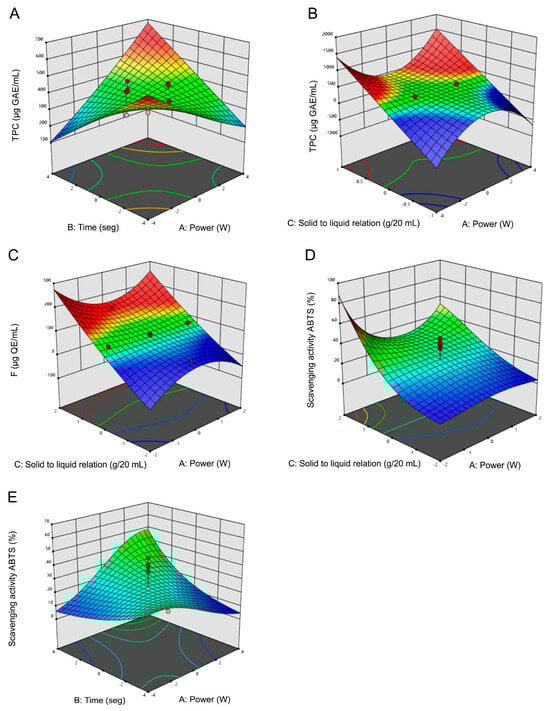 Response surface plots of microwave assisted extraction (MAE) of total phenolic compounds (TPC), flavonoids (F) and scavenging of ABTS•+ percentages. Influence on TPC extraction of (A) time vs. MAE Power, (B) solid/liquid ratio vs. MAE Power. Influence on F of (C) solid/liquid ratio vs. MAE Power. Influence on scavenging activity of ABTS•+, (D) solid/liquid ratio vs. MAE Power, (E) time vs. MAE Power. Blue and red areas represented low and high yields of TPC and F concentration or scavenging activity of ABTS•+, respectively.
