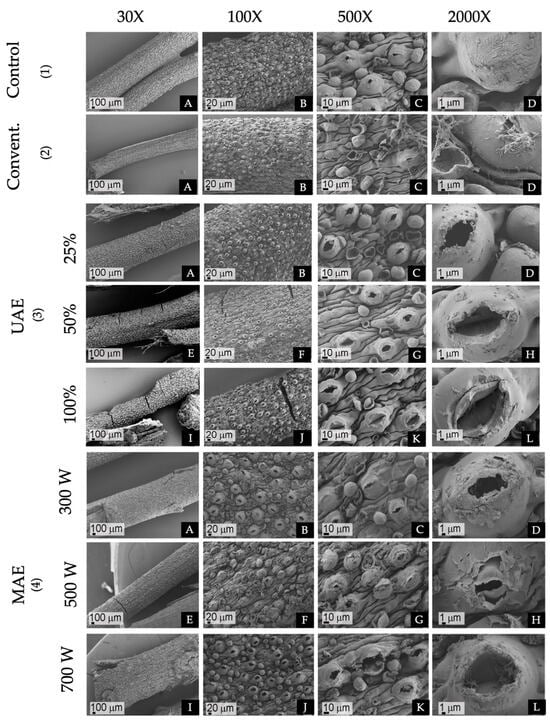 SEM of the material of F. punensis. (1)(A–D) Rehydrated in physiological solution, (2)(A–D) Exposed to conventional maceration (Convent), (3)(A–D) Exposed to UAE (ultrasound-assisted extraction) 25% of amplitude, (E–H) 50% of amplitude and (I–L) 100% of amplitude, (4)(A–D) exposed to MAE (microwave assisted extraction) at 300 W of power, (E–H) 500W of power and (I–L) 700 W of power. Capture taken at 30×, 100×, 500× and 2000×.