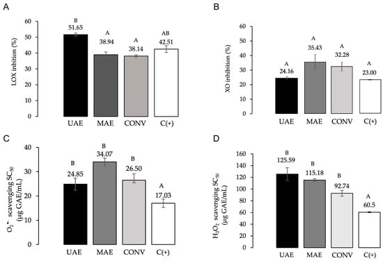 Anti-inflammatory and antioxidant properties of the extracts from F. punensis: conventional maceration (CONV), ultrasound-assisted extraction (UAE) and microwave-assisted extraction (MAE). (A) LOX activity. (B) XO activity. (C) Scavenging activity of O2•− and (D) Scavenging activity of H2O2. GAE: gallic acid equivalents. Naproxen (25 µg/mL) and allopurinol (1 µg/mL) were used as reference inhibitors of LOX and XO enzymes, respectively (C+). Quercetin was included as antioxidant positive control. Values were expressed as the mean of three determinations ± standard deviation. Different letters above the bars represent statistically significant differences at p ≤ 0.05, according to Tukey’s test.
