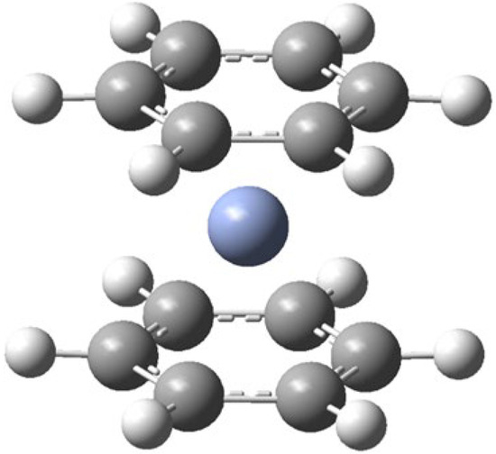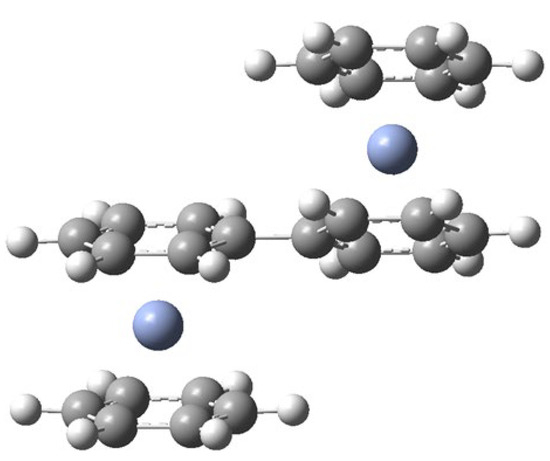 It should be noted that biphenyl-coordinated chromium compounds were formed in very early syntheses of chromium phenyl compounds by the reaction of phenyl magnesium bromide (PhMgBr) with anhydrous chromium(III) chloride (CrCl3) in benzene solution [19]. Although, at the time of this early work by Hein (1918–1936) [20], it was not known that biphenyl itself formed during the reaction to produce the metallocene compound, η6-bis(biphenyl)chromium (I) bromide. In later work, the structure we propose in Figure 8 (BzCrBPCrBz) was actually produced and characterized (among many other chromium arenes) by the direct deposition of Cr(g) with benzene(g) and biphenyl(g) on cold surfaces [21].