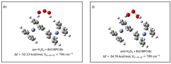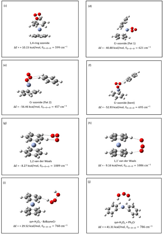 Gaussian structures with symmetric ozonides. (a–j): potential products from the reaction: product; (k,l): potential products from the reaction: product. ΔE values represent the differences in energy between the structure represented and the Bz2Cr + O3 reactants; represents the antisymmetric vibrational frequency of the ozonide product. Reference for the calculated value for in ozone: 1183 cm−1 (239 km/mol).