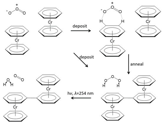 The Bz2Cr---O3 complexes and the uncomplexed O3 and Bz2Cr species will be fairly isolated at the beginning of the deposition. However, as deposition proceeds over a 20–24-h period, the pressures of Ar and O3 gases decrease and so do their deposition rates. Bz2Cr, on the other hand, is fed into the depositing Ar stream by its constant vapor pressure at . So, the relative proportion of Bz2Cr in the matrix increases toward the end of deposition. As a result, formation of the Bz2Cr---O3 complexes will be more numerous toward the end of the deposition process. In addition, the likelihood of these complexes encountering another molecule of Bz2Cr will also increase. Consequently, during late-term deposition or during annealing to 35 K, three-way encounters like Bz2Cr---O3 + Bz2Cr will more likely occur. These encounters of non-isolated molecules in the matrix could conceivably lead to a coupling reaction between the Bz2Cr species, splitting out H2O3 and probably going through a BzBzyneCr-like intermediate. This coupling would result in a coupled benzene-chromium-biphenyl-chromium-benzene (BzCrBPCrBz) product, where BP = biphenyl. The energy of this overall reaction is very favorable at for the syn-H2O3 and for the anti-H2O3 product. The calculated energies and structures are shown in Figure 4k,l. There is evidence in the literature for the formation of biphenyl from the reaction of benzene with benzyne [17,18]. The calculated structure for the BzCrBPCrBz molecule is shown in Figure 8 and the proposed mechanism for this coupling reaction is shown in Scheme 1.