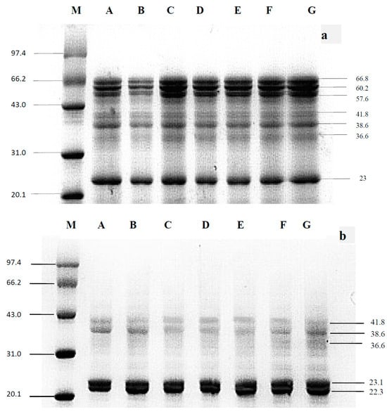 Standard and reducing sodium dodecyl sulfate–polyacrylamide gel electrophoresis (SDS-PAGE) of almond protein isolate (API). (a) Standard and (b) reducing gel conditions. Lane M, marker; Lane A, untreated control sample; Lanes B–G, API samples treated with high-power ultrasound (HUS) at 200 W for 15 min (Lane B), 200 W for 30 min (Lane C), 400 W for 15 min (Lane D), 400 W for 30 min (Lane E), 600 W for 15 min (Lane F), and 600 W for 30 min (Lane G).