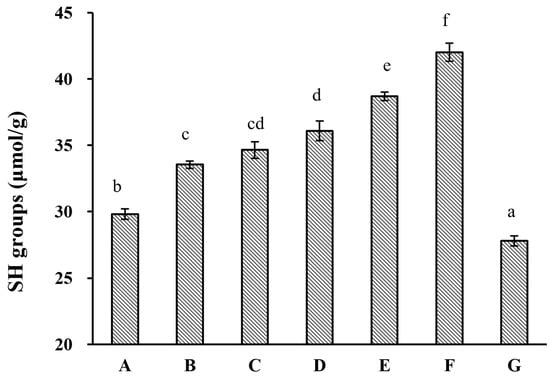 Surface sulfhydryl (SH) group content in almond protein isolate (API) samples. (A) Free surface SH content in untreated control samples. (B–G) Free surface SH content in API samples treated with high-intensity ultrasound (HUS) at (B) 200 W for 15 min, (C) 200 W for 30 min, (D) 400 W for 15 min, (E) 400 W for 30 min, (F) 600 W for 15 min, and (G) 600 W for 30 min. Lowercase letters above each bar represent statistical significance groups at p < 0.05.