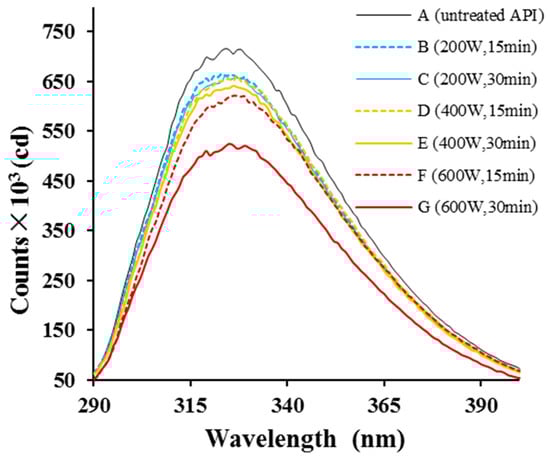 To analyze intrinsic API fluorescence, the samples were suspended in a phosphate buffer (pH 7.0) to 1.5 mg/mL, and then centrifuged with 10,000× g at RT for 10 min. The supernatant was removed and excited at 295 nm (with a 3.0 nm bandwidth) in an FS-5 fluorescence spectrophotometer (Edinburgh, UK). Emission spectra were collected at 300–400 nm (with a 2.0 nm bandwidth).