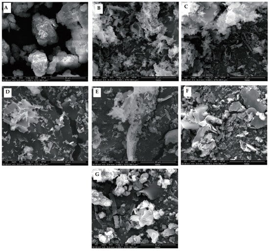 Microstructure of lyophilized almond protein isolate (API) samples as visualized with scanning electron microscopy. (A) Structure of untreated control API sample. (B–G) Structures of representative API samples treated with high-intensity ultrasound (HUS) at (B) 200 W for 15 min, (C) 200 W for 30 min, (D) 400 W for 15 min, (E) 400 W for 30 min, (F) 600 W for 15 min, and (G) 600 W for 30 min.