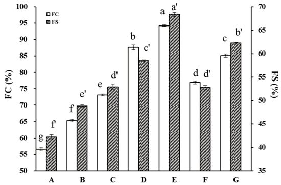 Foaming capacity (FC) and foaming stability (FS) characters of almond protein isolate (API) samples. (A) FC and FS values for untreated control API samples. (B–G) FC and FS values for API samples treated with high-intensity ultrasound (HUS) at (B) 200 W for 15 min, (C) 200 W for 30 min, (D) 400 W for 15 min, (E) 400 W for 30 min, (F) 600 W for 15 min, and (G) 600 W for 30 min. Lowercase letters above each bar represent statistical significance groups at p < 0.05. Error bars show standard deviation.