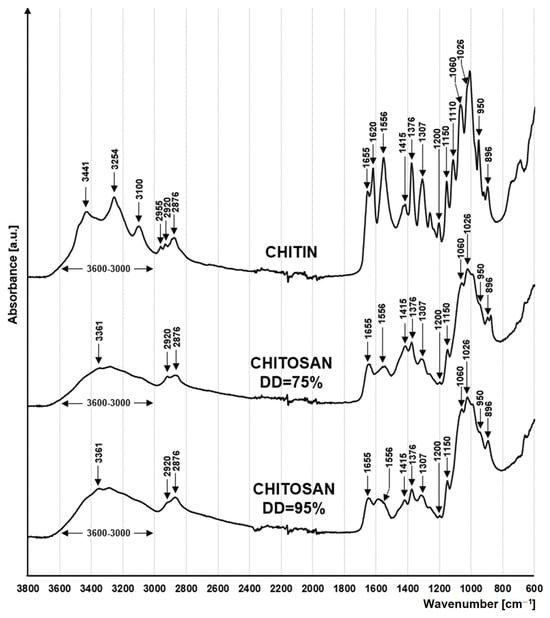 A characteristic feature of chitosan is the primary amino groups that are formed as a result of deacetylation. The presence of -NH2 groups in the material is evidenced by the peak at 3361 cm−1 [34], which is best seen in chitosan with DD = 95%.