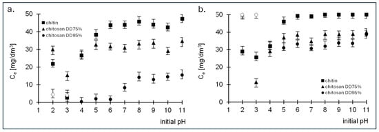 The sorption capacity of the tested sorbents was determined at initial concentrations of the colourants RB5 and RY84 of 5–500 mg/dm3 (chitin) and 5–1000 mg/dm3 (chitosan DD75% and DD95%). This study was conducted at a pH and equilibrium time determined in an earlier phase.