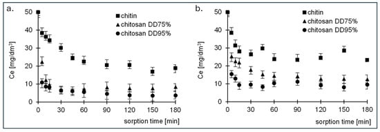 The sorption equilibrium time for both dyes was longer for chitin and was 90 min. For the two tested chitosan samples, equilibrium was reached after a much shorter time of 30 min.