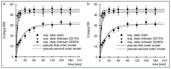 Experimental data from studies on the kinetics of sorption of RB5 and RY84 to chitin and chitosan (DD75% and DD95%) are described by pseudo-first-order and pseudo-second-order models (Figure 4, Table 1). In each research series, the pseudo-second order model showed better fit to the obtained data, which is a typical result for the sorption of organic dyes on biosorbents.