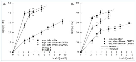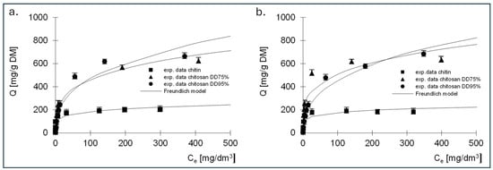 This is confirmed by the sorption capacities determined for two types of active sites. In case of chitin, the b1 values describing the capacities at the active sites of the first type were about three times higher than the b2 values describing the capacities at the active sites of the second type. In case of chitosan DD95%, an inverse relationship was observed. The K2 values were higher than the K1 values and the b2 values were also higher than the b1 values.