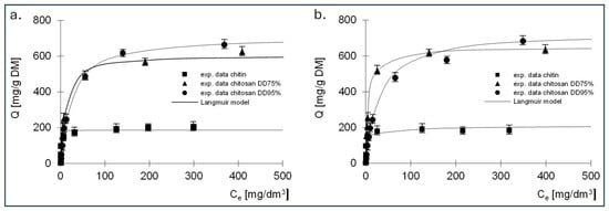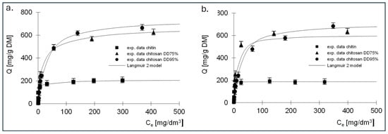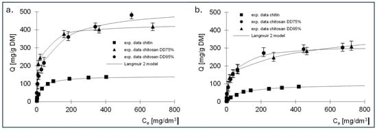 The best fit of the experimental data was obtained for the Langmuir 2 model; therefore, the mechanism of dye sorption was discussed based on this model. The presented data show that, regardless of the dye tested, the adsorption capacity of chitin at 211 mg/g DM for RB5 and 192 mg/g DM for RY84 was three times lower compared to chitosan adsorbents (680–742 mg/g DM for RB5 and 650–760 mg/g DM for RY84).
