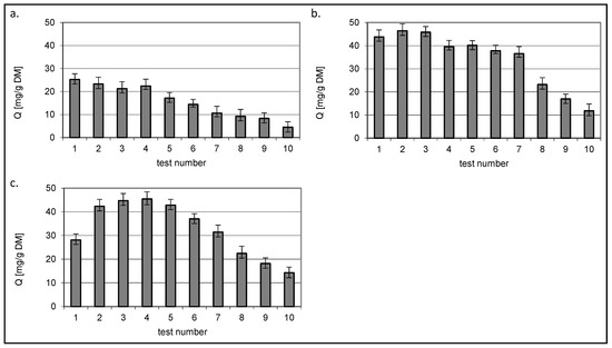 Based on the results from the first phase of the study, it can be concluded that the pH value of the aqueous solutions of dyes has a significant influence on sorption efficiency. For both dyes tested, it was observed that the sorption efficiency decreased with the increase in pH. In the article by T. Jóźwiak et al. [1], in which they investigated the effects of the degree of chitosan deacetylation on the sorption of RB5 dye from aqueous solutions, they obtained the highest sorption capacity at a pH of 4, while above this pH the sorption efficiency decreased for all tested sorbents. Moreover, in the article by U. Filipkowska et al. [35], in their study of the sorption efficiency of the dyes RB5 and RY84 using chitin and chitin subjected to the ammonification process as sorbent, they showed that the adsorption of both anionic dyes is most effective at low pH values. For chitin, the pH value is 2–4, while for modified chitin the sorption of dyes was highest at pH 2–3. At higher pH values, a decrease in efficiency was also observed as the pH of the solution increased.