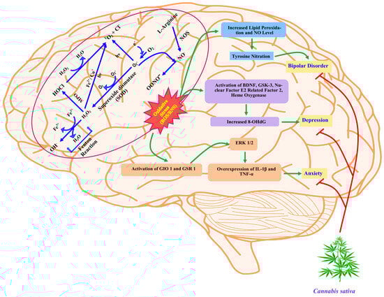 Schematic representation illustrating how the production of free radicals (ROS/RNS) affects biological systems by causing cellular stress and even resulting in various mental illnesses, as well as how Cannabis sativa may help to treat these. [HOCl: Hypochlorous acid; H2O2: Hydrogen peroxide; 1O2: Singlet oxygen; O2.−: Superoxide; OH•: Hydroxyl radical; OONO−: Peroxynitrite; NO.: Nitric oxide; Fe2+: Iron ion; Cu2+: Copper ion; Cl−: Chlorine ion; ROS: Reactive oxygen species; RNS: Reactive nitrogen species; NOS: Nitric oxide synthase; MPO: Myeloperoxidase; BDNF: Brain-derived neurotrophic factor; GSK-3: Glycogen synthase kinase 3; 8-OHdG: 8-hydroxy2-deoxyguanosine; ERK: Extracellular signal-regulated kinases; IL-1β, interleukin 1 beta; TNF α: Tumor necrosis factor α].