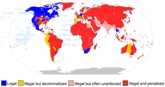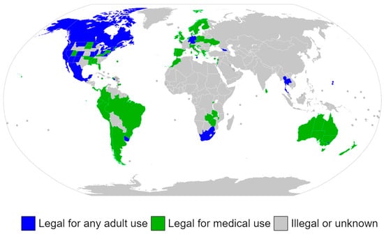 Three United Nations treaties—the 1968 Convention Against Illicit Traffic in Narcotic Drugs and Psychotropic Substances, the 1971 Convention on Psychotropic Substances, and the 1961 Single Convention on Narcotic Drugs—regulate these practices in many countries [99,100]. Under the Single Convention, cannabis was reclassified in 2020 from a Schedule I and IV drug to a Schedule I only substance (with Schedules IV, I, II, and III being the tightest-controlled to least) [101,102]. Although cannabis is classified as a Schedule I substance under the treaty, some countries may permit its medical use, even though it is highly addictive and has a high potential for abuse [102]. Although a few countries have decriminalized the use of cannabis by making simple possession of it an infraction that is treated like a minor traffic offense, many nations forbid its recreational use. Some countries in the Middle East and the Far East have much harsher laws, such as those that punish even minor amounts of possession with years in prison [103]. Canada, Georgia, Germany, Luxembourg, Malta, Mexico, South Africa, Thailand, and Uruguay, together with 24 states, 3 territories, and the District of Columbia in the United States, and the Australian Capital Territory in Australia, are among the nations that have legalized cannabis for recreational purposes (Figure 3).