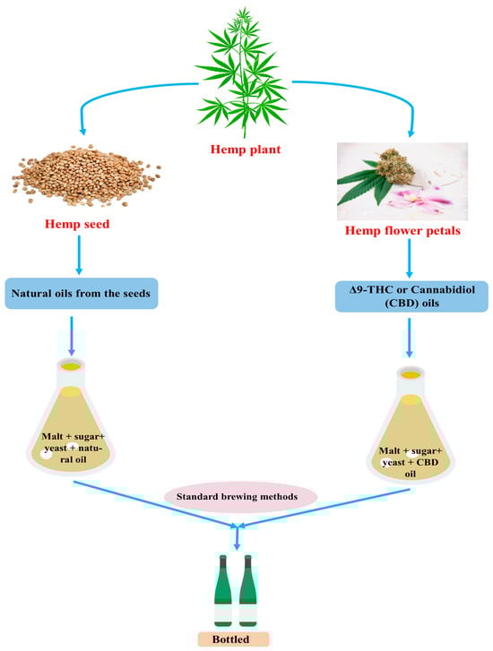In early 2017, hemp or cannabis-infused alcohol became popular. The federal ban on marijuana and the relaxation of regulatory barriers for cannabis plant parts other than the seed, which contains psychoactive Δ9-THC, led to this outcome [10]. Conventional brewing methods are used, together with the addition of hemp or cannabis. Whole and hulled hemp seeds, hemp seed oil, and hemp seed flour are foods derived from the hemp plant and are used as flavorings in beer [113]. There are no indications that the trend of cannabis-infused beer businesses blending their products will soon come to an end. Indeed, the availability of hemp beer and cannabis-infused beer has contributed to the rise in the popularity of craft beer. Hemp beer and cannabis-infused beer, also known as CBD- or Δ9-THC-infused beer, are two types of cannabis beer made from marijuana or hemp. Hemp beer uses natural oils from seeds to enhance its flavor, while CBD-infused beers use the standard brewing method with CBD oil (Figure 5). However, beers infused with THC are not alcoholic, as it is against the law to combine alcohol and THC, limiting their alcohol content to 0.5% by volume [10]. Due to their oily and hydrophobic nature, α-acids and cannabis are both poorly soluble in water, making it challenging to directly incorporate them into drinks. On the other hand, the α-acids undergo isomerization through boiling in a mildly acidic solution, resulting in iso-α-acids that possess an organoleptic bitter taste and are more soluble. Encapsulation, microemulsions, biopolymer nanoparticles, and filled hydrogel beads are the components of the colloidal delivery method for cannabis oil. These mechanisms guarantee cannabis distribution to the user by stabilizing the compounds against oxidation in a water-based beverage [114]. There are beers with Δ9-THC infusions available that have an alcohol-by-volume (ABV) of less than 0.5% and an Δ9-THC concentration ranging from 5 to 10 mg [115]. In contrast to Δ9-THC beers, CBD-infused beers include 10 milligrams of CBD and range in alcohol content from 3.5 to 6% ABV. When consumers consume CBD beers, they report “elevating” and “naturally calming” feelings, but THC beer causes intoxication, euphoria, lethargy, and occasionally cravings. The daily consumption of foods containing hemp should not amount to more than 12 μg of Δ9-THC per kilogram of body weight, as advised by the German Federal Institute for Health Protection of Consumers and Veterinary Medicine. This estimate indicates that 5 μg/kg of THC is present in beverages, both alcoholic and non-alcoholic [116].