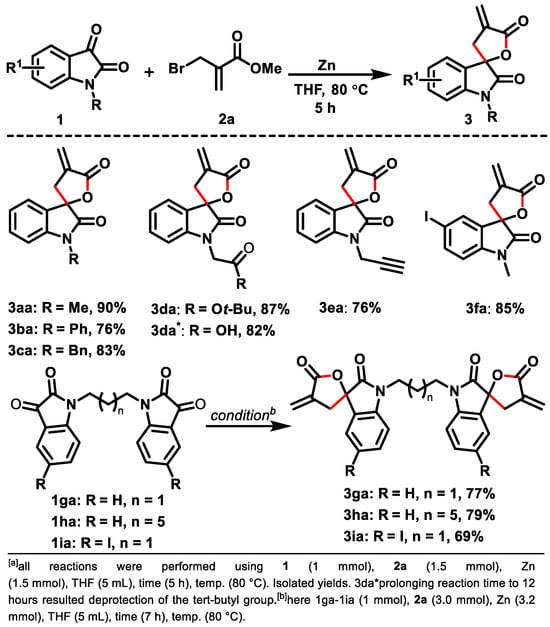 To zinc (1.5 mmol) in an anhydrous THF solvent (3 mL), substituted isatin (1; 1 mmol) and methyl 2-(bromomethyl)acrylate (2; 1.5 mmol) were added in sequence in a sealed tube at r.t. under N2. The reaction tube was directly sealed and reacted at 80 °C (oil bath temperature) for 5 h and the progress of the reaction was monitored via thin-layer chromatography. Once the reaction was completed, the mixture was cooled to room temperature and quenched via the addition of 1N HCl (2 mL). The resulting mixture was extracted with ethyl acetate (3 × 5 mL) and the combined organic layers were dried over Na2SO4, filtered, and concentrated under reduced pressure. The crude product was purified by means of flash chromatography on silica gel to give the corresponding product.