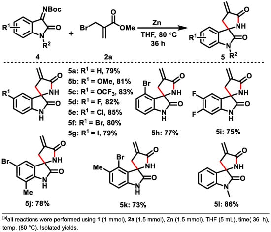 To zinc (1.5 mmol) in an anhydrous THF solvent (3 mL), substituted isatin imines (4; 1 mmol) and methyl 2-(bromomethyl)acrylate (2; 1.5 mmol) were added in sequence in a sealed tube at r.t. under N2. The reaction tube was directly sealed and reacted at 80 °C (oil bath temperature) for 36 h and the progress of the reaction was monitored via thin-layer chromatography. Once the reaction was completed, the mixture was cooled to room temperature and quenched via the addition of 1N HCl (2 mL). The resulting mixture was extracted with ethyl acetate (3 × 5 mL) and the combined organic layers were dried over Na2SO4, filtered, and concentrated under reduced pressure. The crude product was purified by means of flash chromatography on silica gel to give the corresponding product.
