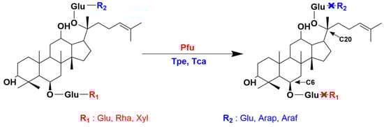 Regioselectivity of ginsenoside hydrolases. Ginsenoside hydrolases (Pfu, Tpe, Tca) with different regioselectivities can catalyze different sugar groups (R1 and R2) at the C6 and C20 positions of ginsenosides.