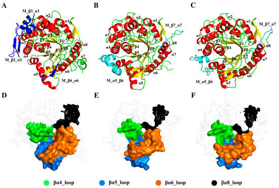 GHs with different regioselectivities share a typical (β/α)8-barrel structural architecture, which is commonly found in glycoside hydrolase family 1 (Figure 2). This structural form, known as the TIM-barrel fold, was first discovered in the triosephosphate isomerase (TIM) [39]. Despite the high similarities in their core structures, the selected GHs exhibit several insertions or deletions in the peripheral rings, labeled as M regions (Figure 2A–C). In Pfu, fragments of the sequence were inserted into the βα2, βα3, and βα6, denoted as M_β2_α2, M_β3_α3, and M_β6_α6, respectively. For Tpe and Tca, insertions occur between α5 and β6, and within βα7, recorded as M_α5_β6 and M_β7_α7, respectively. These insertions or deletions in peripheral loop regions will influence the structural flexibility of GHs.