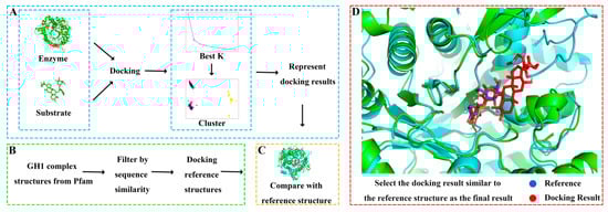 Molecular docking process. (A) Obtaining representative docking poses by clustering a large number of docking results. (B) Screening reference structures from glycoside hydrolase family 1. (C) Selecting the docking pose closest to the reference structure as the final result. (D) Local comparison of the final docking result of ginsenoside hydrolase Pfu and substrate R1 with the reference structure 8B81.